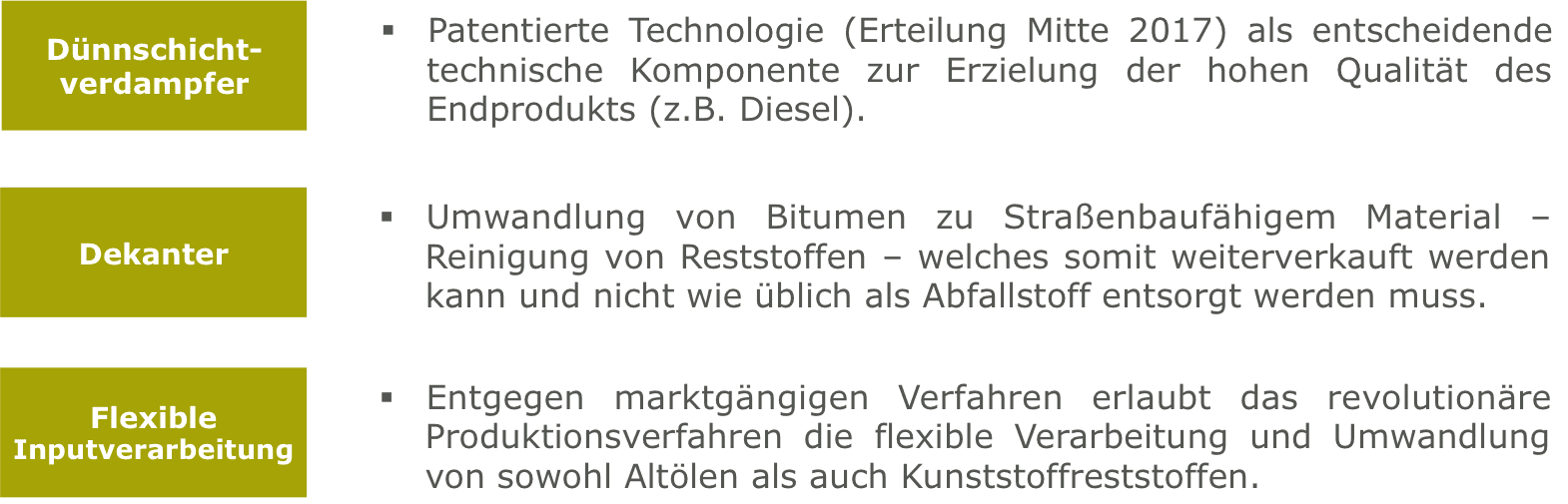 In den letzten 10 Jahren wurde das patentierte Depolymerisationsverfahren zur Umwandlung von Altöl und Plastikmüll in unserer Pilotanlage getestet und im Herstellungsprozess optimiert, so dass wir in grossen Mengen hochwertigen Diesel und Heizöl täglich herstellen können.